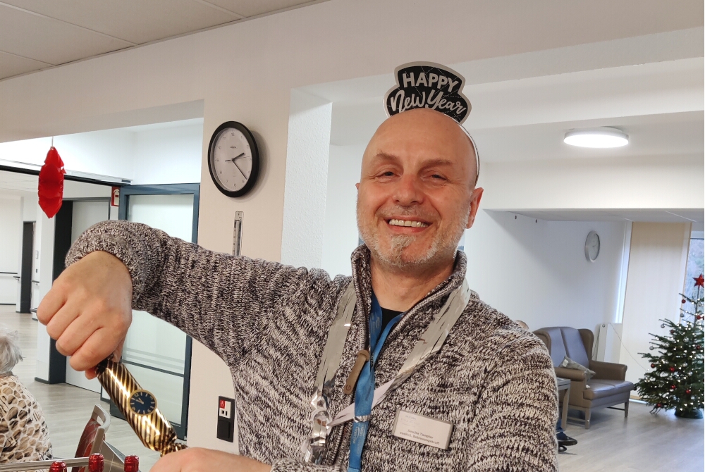Feierlich zog der Betreuungsdienst alle Register: Der war von Wohnbereich zu Wohnbereich gewandert und verwandelte jeden in eine Silvester-Oase. Gemeinsam hatten sie nicht nur mit den Seniorinnen und Senioren angestoßen, sondern auch gefeiert. Nach und nach hatten sich die Gemeinschaftsräume mit Neujahrswünschen gefüllt, Tischfeuerwerk hatte fröhlich geknistert und Knallbonbons hatten mit Knackgeräuschen überrascht – ganz zur Freude und mit gelegentlichen Schreckmomenten der Anwesenden.