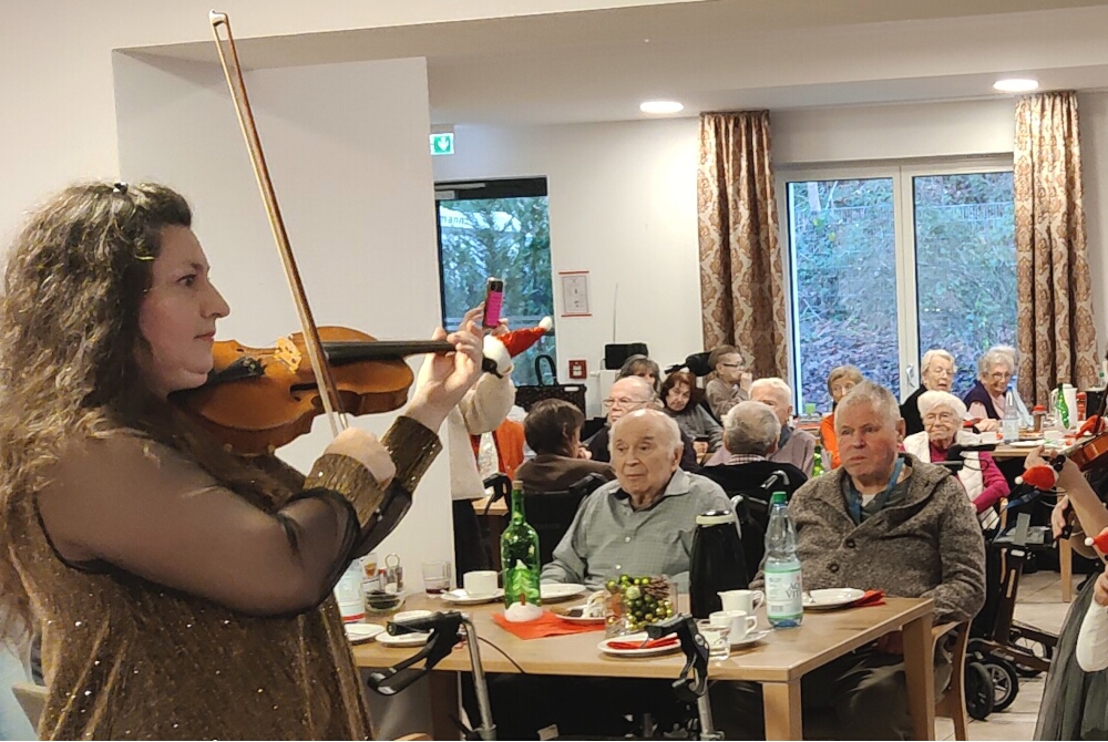 Am 18. Dezember 2025 war es endlich so weit – und die Bewohnerschaft feierte gemeinsam: Bei der Feier hatte der Gastmusiker Herr Pfeiffer für die musikalische Begleitung gesorgt genauso wie die Kinder einer Geigenklasse von Frau Witek. Die waren im residenzeigenen Restaurant aufgetreten und hatten anschließend auf allen Wohnbereichen gespielt. Sie hatten mit modernen und traditionellen Liedern das Publikum begeistert.
