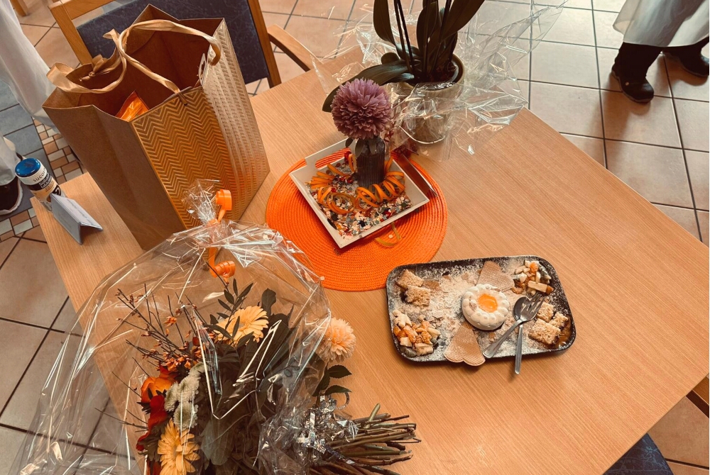 Einrichtungsleiterin Gabriele Schäfer, die stellvertretende Pflegedienstleiterin Erna Ermisch und die Pflegedienstleiterin Lisa Weiß planten eine klasse Überraschung: Die Verabschiedung von Sümeyye Aslan im Speisesaal. Dort waren dafür Mitarbeitende der Pflege, der Betreuung und der Küche erschienen. Die Verwaltung hatte ein kleines Wohlfühlpaket mit Snacks, Badezusatz, Tee und Kerzen zusammengestellt. Dazu hatte die Küche die kleine Gesellschaft mit Salat und Nachtisch verwöhnt – ergänzt durch einen Blumenstrauß von der Einrichtung.