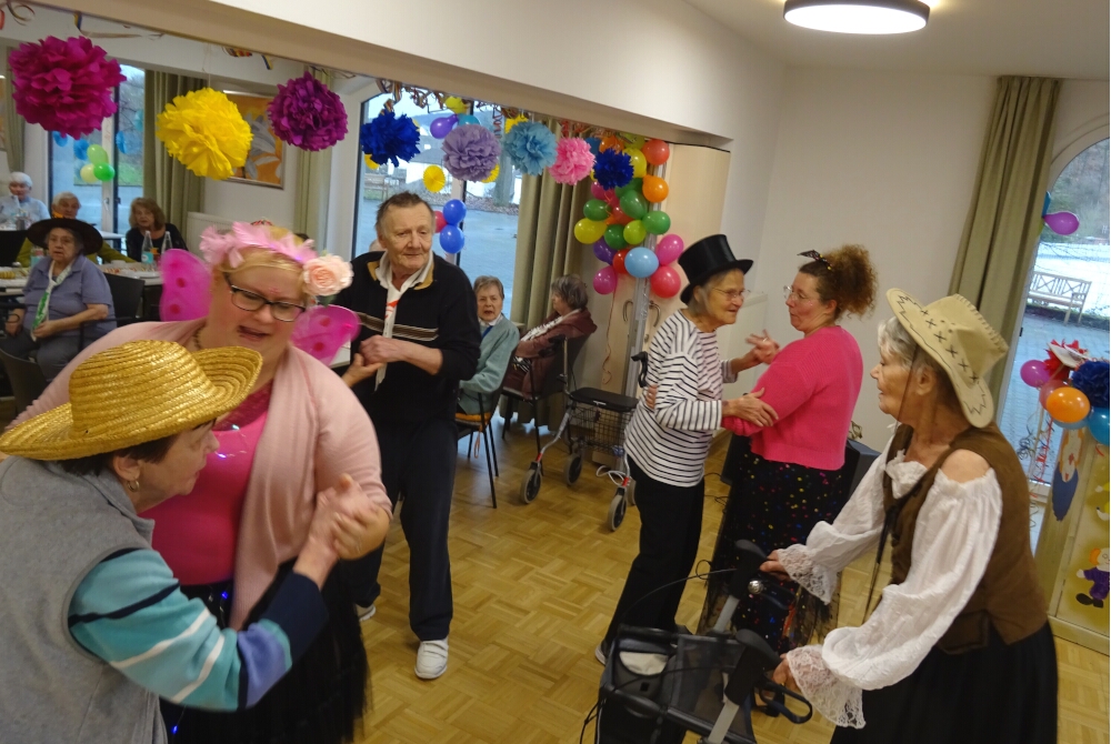 Farbenfrohe Kostüme, Girlanden und Ballons: Viele hatten sich kreative und fantasievolle Verkleidungen angelegt und der Betreuungsdienst hatte ein Programm vorbereitet. Eine Büttenrede und eine musikalische Darbietung von ihnen war bestens beim Publikum angekommen – und sorgte für Feierstimmung an Fastnacht.