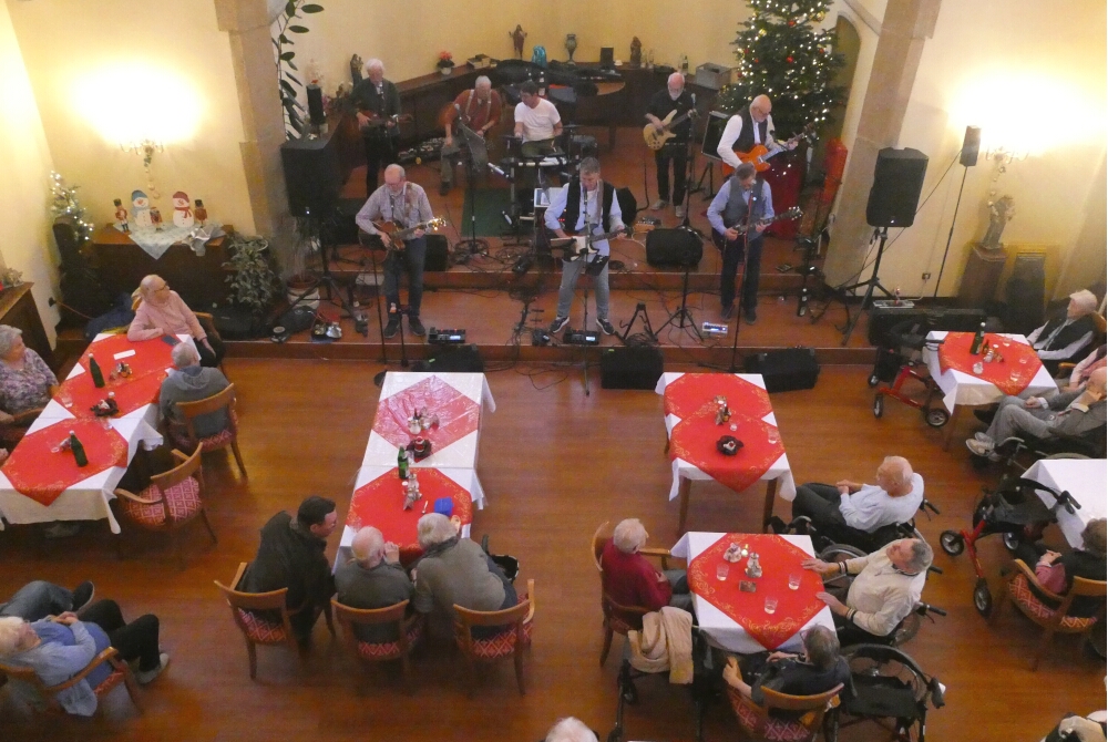Vorweihnachtsstimmung im festlich geschmückten Raum: Mit bestem Blick auf die Bühne in historischen Gemäuern hatten sich Seniorinnen und Senioren an Tischen versammelt. Sie hatten sich gefreut, wieder die „Gitarrenstrünzer“ – eine regional bekannte Linzer Band – zu hören.