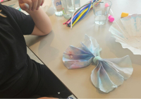 Einfachen Materialien Leben einhauchen – das ging ganz simpel: Weiße Kaffeefilter bemalten die Bastelfreunde mit Filzstiften und besprenkelten sie anschließend mit Wasser aus kleinen Pipetten. Dadurch vermischten sich die Farben harmonisch. Dann legten die Kreativen das Papier zum Trocknen und falteten die Filter danach wie bei einer Ziehharmonika. Damit die Schmetterlinge ihre Form annehmen konnten, fixierten sie die Flügel mit farbigen Pfeifenreinigern.