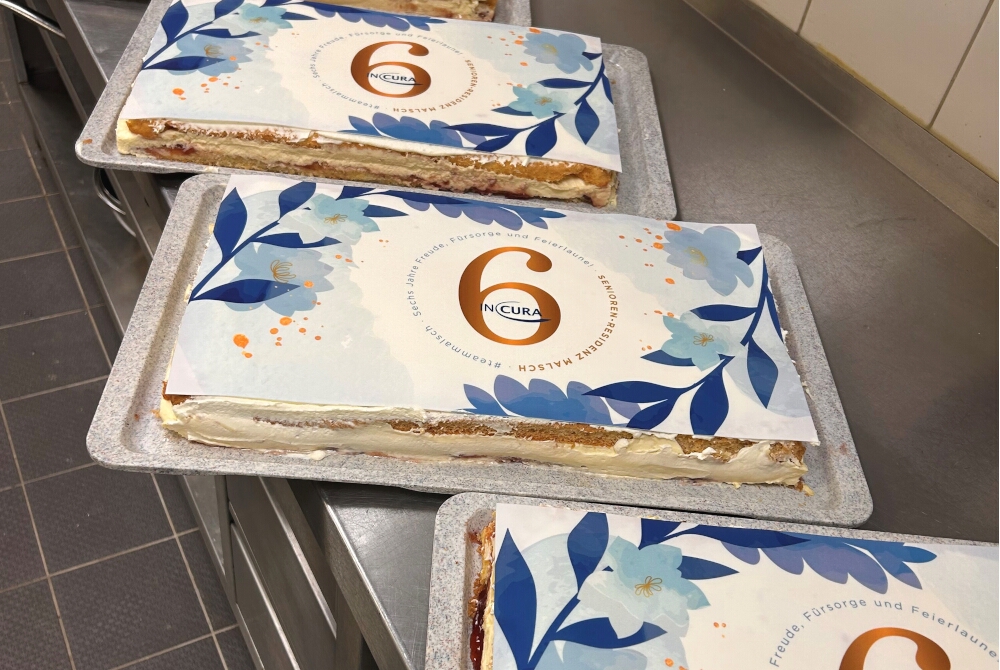 Ein Stückchen Torte garniert mit Fürsorge: Im Anschluss hatten sich die Feiernden mit Kaffee und Kuchen gestärkt, bei dem natürlich die passende Jubiläumstorte nicht fehlen durfte. Diese hatte das Küchenpersonal liebevoll zubereitet und mit einem besonderen Tortenaufleger in Form der Zahl „6“ verziert. Auf der süßen Leckerei stand auch das Festmotto „6 Jahre Freude, Fürsorge und Feierlaune!“. Küchenleiter Andreas Zanger hatte die Torte stolz präsentiert, und alle waren begeistert von der schönen Gestaltung.