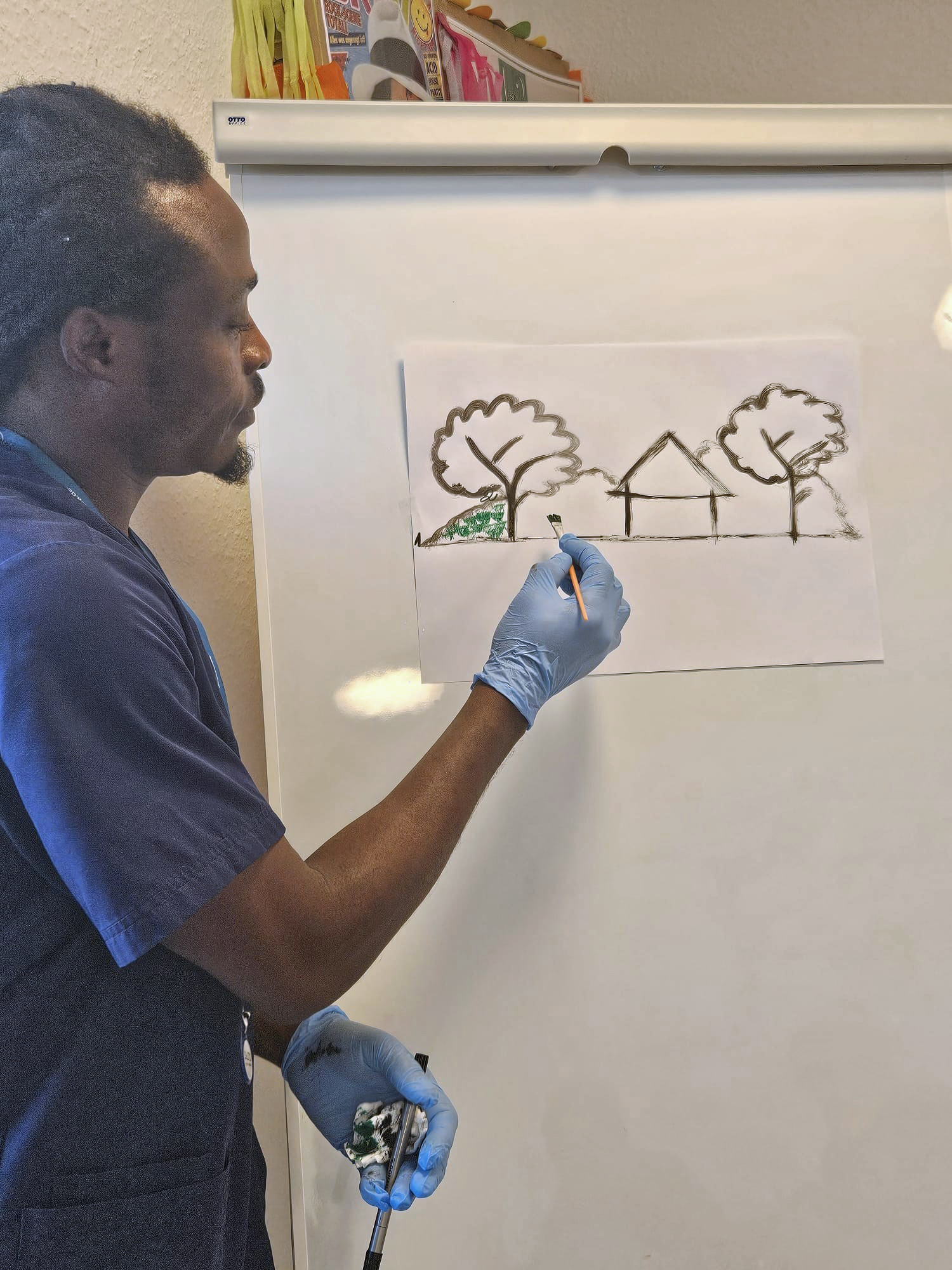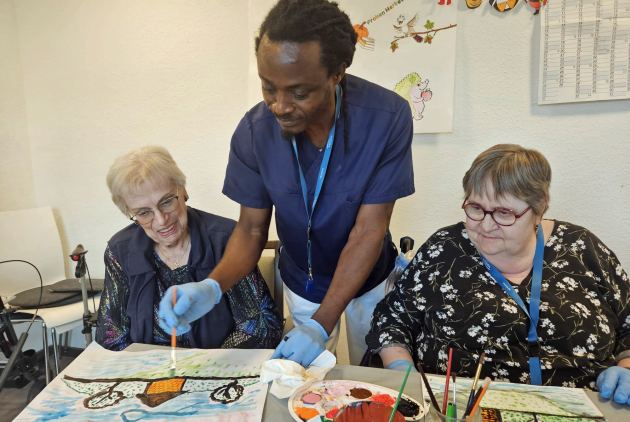 Besonders schön ist es, wenn Mitarbeitende ihre persönlichen Leidenschaften in ihre Arbeit einbringen können. Das hat sich auch Assiongbon Ayih gedacht und einen Malworkshop für „seine“ Seniorinnen und Senioren angeboten. Die Runde traf sich am 27. Oktober 2025 und widmete sich dem Thema „Haus am See“. Dafür stellte der Künstler den Bewohnerinnen und Bewohnern Aquarellfarben, Pinsel, Wassertöpfchen und Malblätter zur Verfügung.
