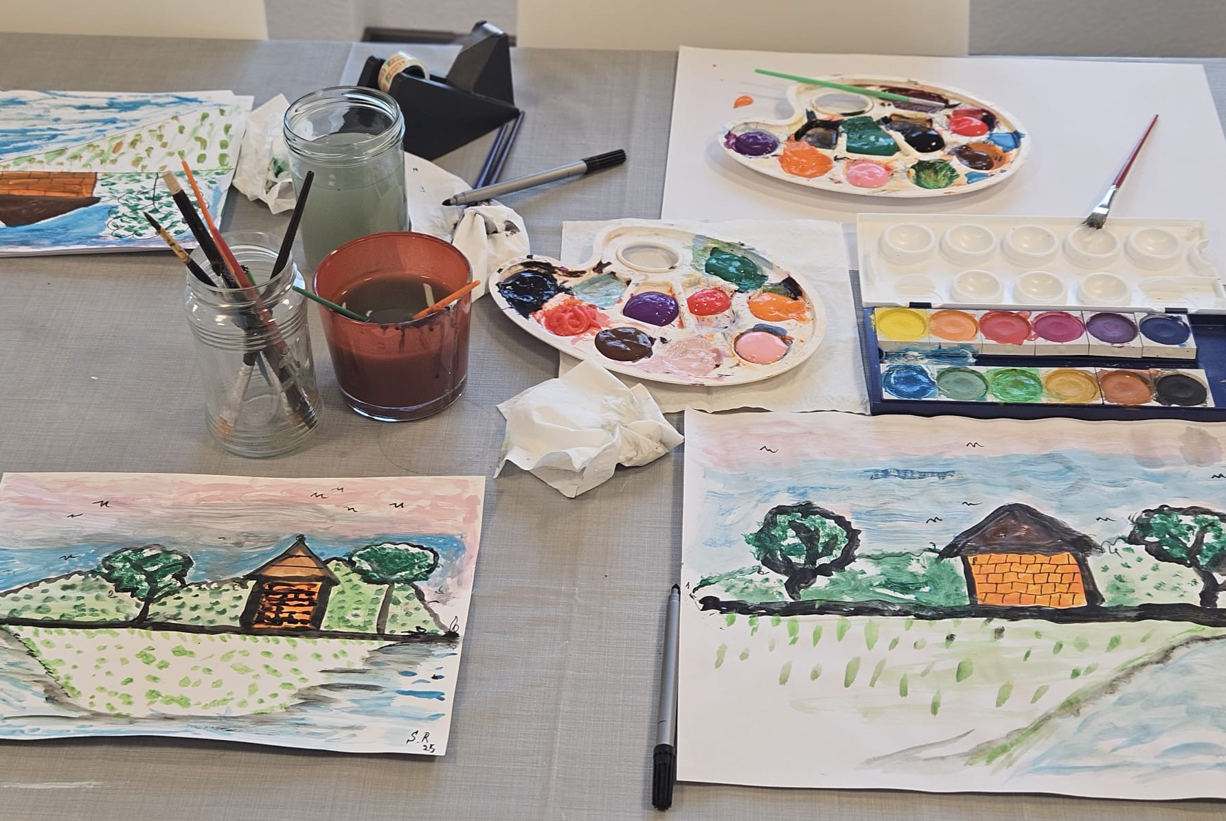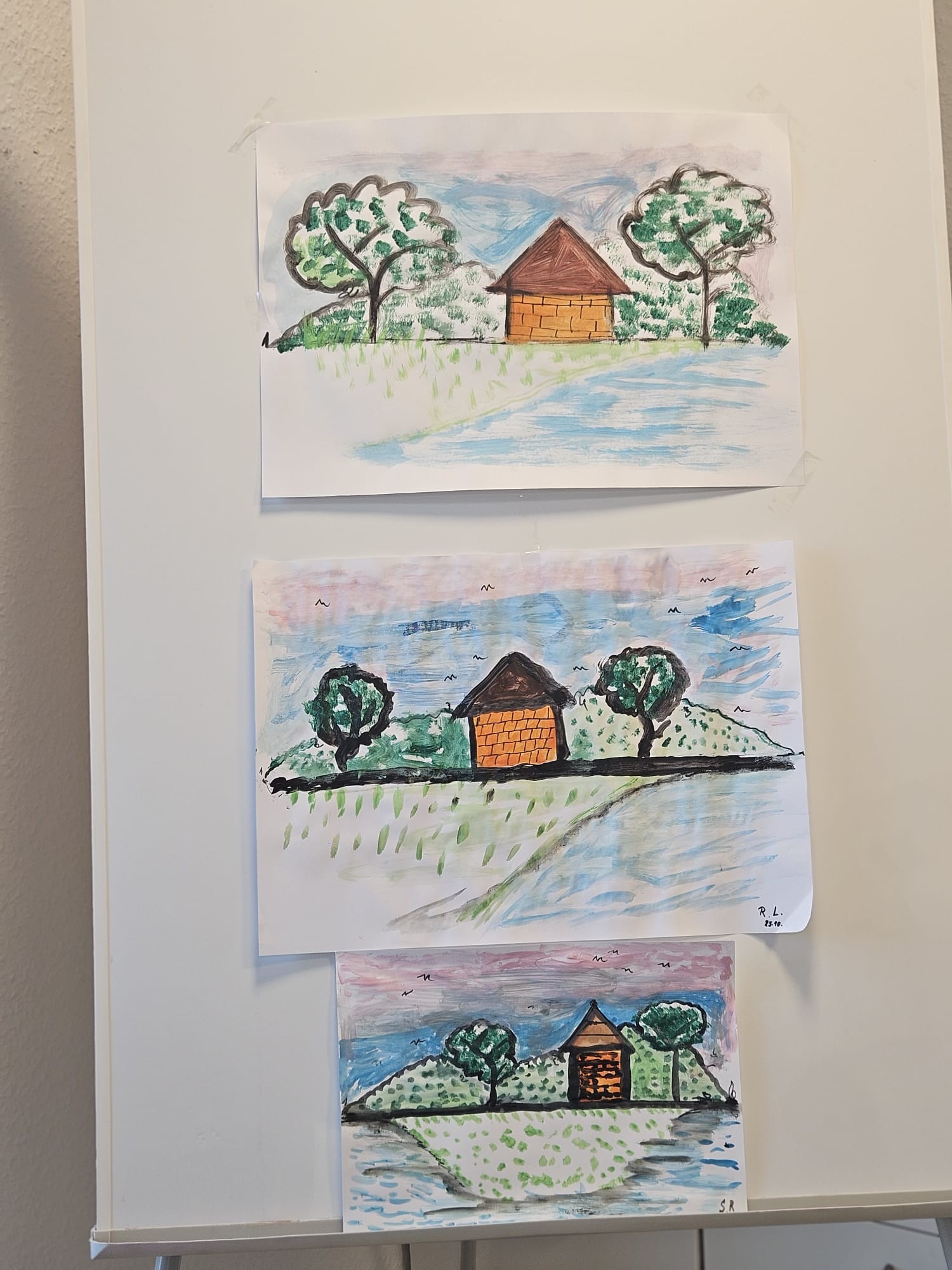 Das Motiv „Haus am See“ ließ kreativen Freiraum für eine Vielzahl an Interpretationen. Die Teilnehmenden hatten etwa eine Stunde Zeit, ihre eigene Version dieses Themas zu gestalten. Assiongbon Ayih stand ihnen während des Gruppenangebotes mit Rat und Tat zur Seite und motivierte jeden, seiner künstlerischen Ader zu folgen.