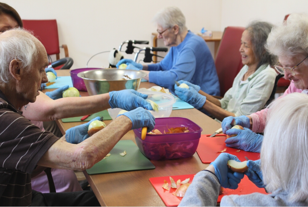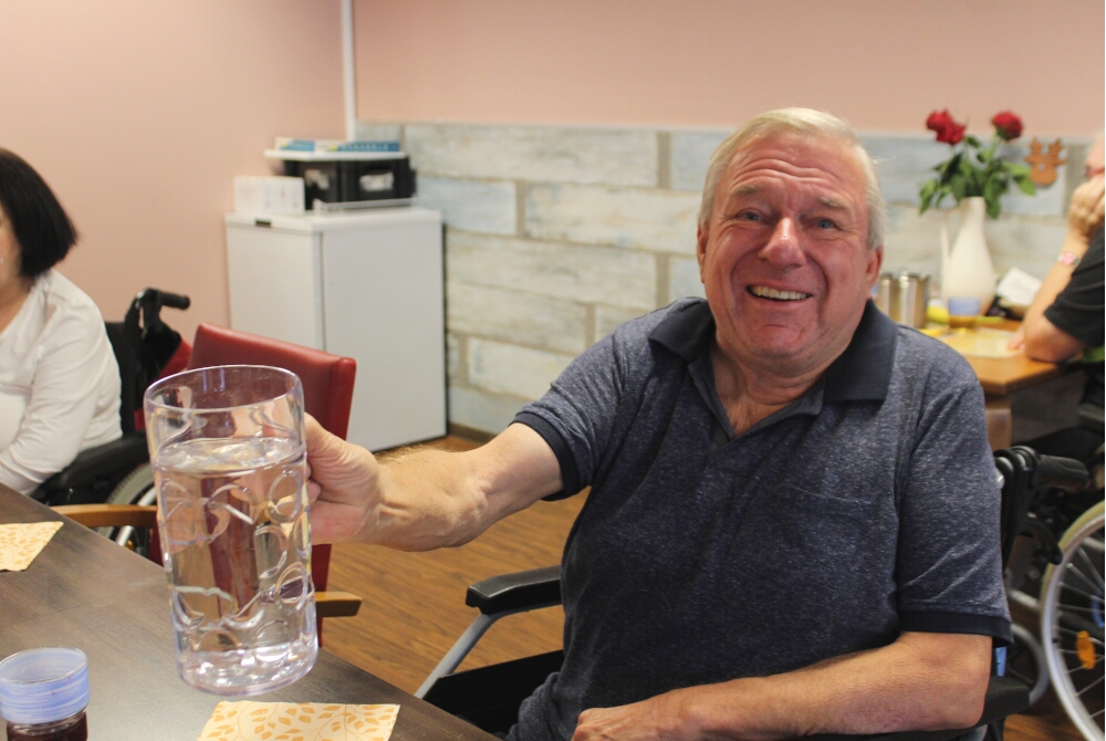 Der Wohnbereich 1 war früh am Tag ebenfalls fleißig am Backen, damit später alle Kartoffel- und Zwiebelkuchen genießen konnten. Neuer Wein gehörte wieder zum kulinarischen Angebot, denn der teilweise vergorene Traubenmost ist typisch für die Pfalz. Ebenfalls regional geprägt waren die Songs, welche Walter auf der Gitarre begleitet sang: Herbst- und Pfälzer Lieder.