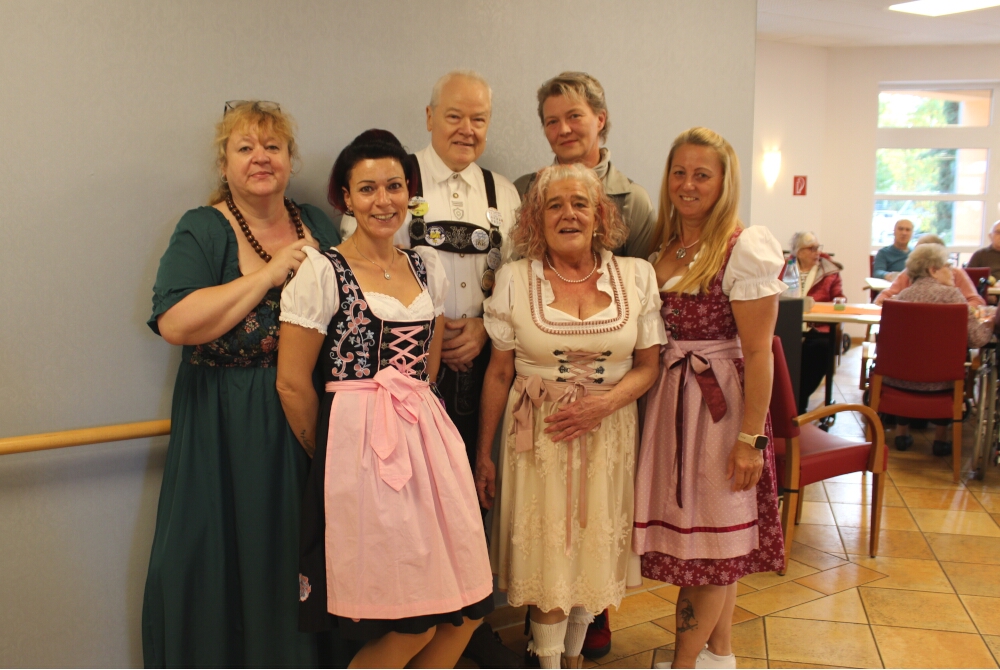 Das größte Fest mit knapp 80 Gästen feierten die Wohnbereiche 2 und 3. Dabei aßen sie Pflaumenkuchen, Saumagen, Kartoffelpüree und Sauerkraut – dazu ließen sie sich die traditionellen Getränke reichen. Als Gastmusiker aus Mannheim trat der Alleinunterhalter „Pik-As“ auf und machte das klingende Fest mit vielen Schunkelrunden und tanzenden Seniorinnen und Senioren perfekt.