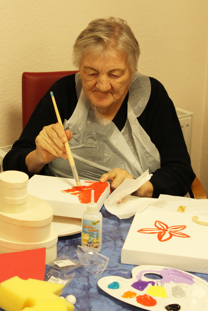 Auch in diesem Jahr wurde gehandwerkelt und gebastelt: In enger Absprache mit dem Betreuungsdienst haben sechs Lilly-Mitarbeiter einen Kreativtag mit dem Gerontopsychiatrischen Wohnbereich angeboten. Gemeinsam mit rund zehn Bewohnerinnen und Bewohnern haben sie Holzschachteln bemalt und Leinwände bedruckt. Alle Materialien sowie die Kosten für ein anschließendes Mittagessen – Salate, Steaks und Würstchen in der Wohnbereichs-Küche – hat Lilly gespendet. Am Nachmittag gab es noch einen gemeinsamen Spaziergang.
